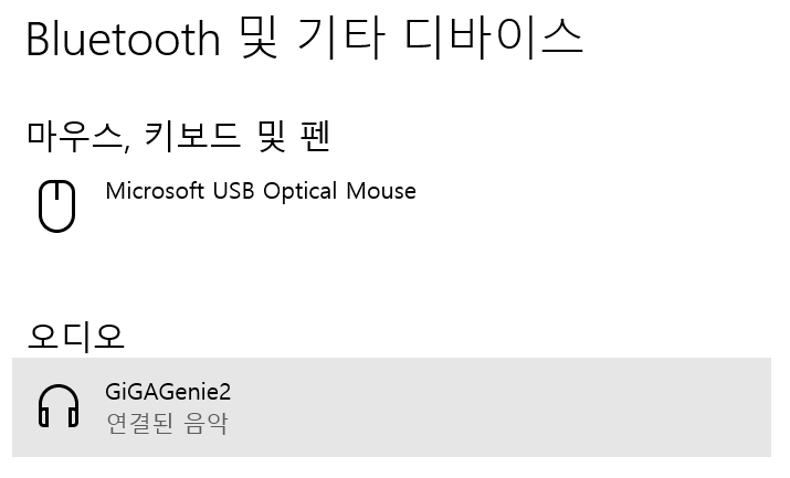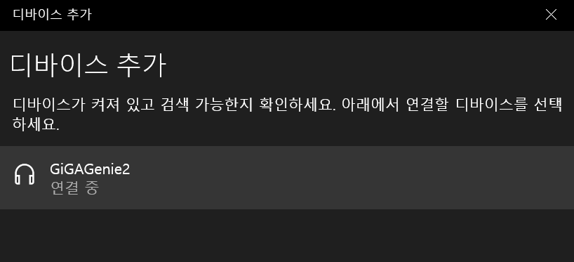 블루투스를 클릭하면 아래와 같이 기가지니 오디오가 뜨게 된다. 만약 안 뜬다면 재빠르게 "지니야, 블루투스 페어링 실행해 줘!" 말한 뒤 재빠르게 디바이스를 추가한다. 기가지니는 좀 늦게 연결하면 페어링을 풀어버리는 성격 급한 아이인 것 같다.