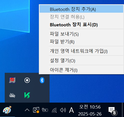 우측 하단에 보이는 블루투스를 찾아 우클릭한다. 그리고 'Bluetooth 장치추가'를 클릭한다. 그리고 보이는 바와 같이 '블루투스 또는 기타 디바이스 추가'를 클릭한다.